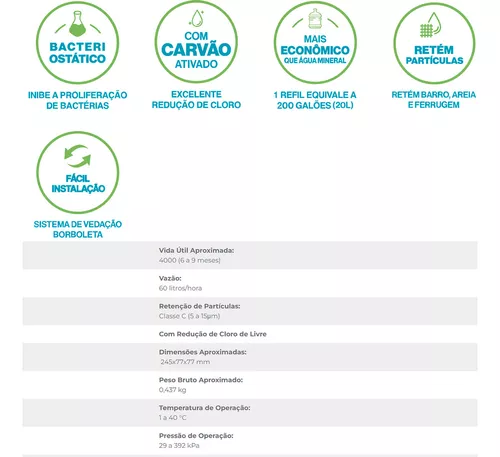 OBS.: este produto é um elemento de reposição. O refil pode saturar antes do previsto (vida útil), dependendo das condições da água de cada região, como o excesso de barro, areia, ferrugem e outras impurezas. Verifique também informações na embalagem do produto ao adquiri-lo.